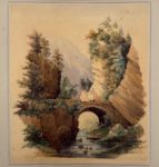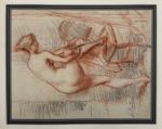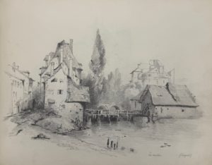 In-4 oblong, cuir de Russie vert, large encadrement doré Romantique, dos lisse orné, tranches dorées (Reliure du XIXe siècle).Dessins par ou attribués à Coignet, Gudin, Renouard, Cham, Henry Monnier, Lepère, Lalanne, Robida, Ozanne, Andrieux, etc… Feuilles : 26 x 34 cm.