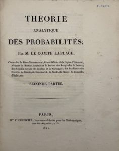 Seconde partie seule, consacrée à la Théorie générale des probabilités (Livre II). La première partie parue quelques mois plus tôt traitait du Calcul des fonctions génératrices (Livre I). Quatre suppléments ont encore été publiés entre 1816 et 1820.