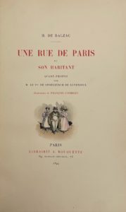 BALZAC Honoré de. Une Rue de Paris et son habitant. Paris, Rouquette, 1899 ; in-8, demi-maroquin rouge à coins, dos très orné (V. Champs). – Illustrations en couleurs de François Courboin. – Vélin avec suite sur Chine.