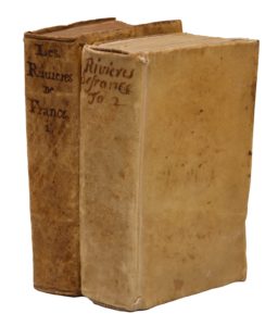 Paris, François Clousier, 1644. 2 tomes en deux volumes in-8, vélin rigide à recouvrements, dos lisse (Reliure de l'époque).Édition originale de cet ouvrage rare et intéressant donnant de nombreux renseignements sur les provinces et les villes par lesquelles passent les cours d'eau décrits.