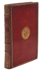 Genève et Paris, Lejay, 1771. - Le Temple de Gnide. [Paris, Dufour, 1773]. 2 ouvrages en un volume in-8, maroquin rouge, triple filet doré, armoiries au centre, dos orné à la grotesque, dentelle intérieure, tranches dorées (Reliure de l'époque).Les Poésies pastorales – suivies de La Voix de la Nature, des Lettres de Sainville et de Sophie et d'autres pièces du même auteur – sont ornées d'un titre-frontispice par Marillier et de 2 vignettes et 2 culs-de-lampe par Eisen.