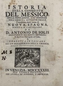 SOLÍS (Antonio de) — Istoria della conquista del Messico, dalla popolazione, e de' progressi nell' America settentrionale conosciuta sotto nome di Nuova Spagna... Terza impressione veneta.