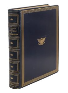 Paris, Hachette, 1909 ; in-4, reliure de l’éditeur maroquin à long grain bleu marine, six filets dorés en encadrement sur les plats, armes des Orléans au centre, dos à nerfs ornés de couronnes et de filets dorés, tranches dorées. Édition originale ornée de nombreux portraits et scènes d’après les tableaux conservés au musée Condé.