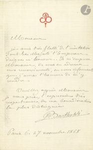 Auguste BARTHOLDI (1834-1904). L.A.S., 27 novembre 1868 ; 1 page in-8 à son monogramme gravé. « Je suis très flatté de l’invitation dont Sa Majesté l’Empereur daigne m’honorer ». Il aura...