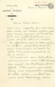 « que vous auriez un jour la bonté de faire une petite conférence à notre Société libre des Artistes ». En attendant que ce vœu se réalise, il l’invite au banquet annuel de la société : « J’aimerais vous faire faire connaissance avec notre réunion, son esprit, ses tendances et ses efforts. J’ose croire que vous aurez une impression agréable de votre soirée ; en tous cas vous vous trouverez avec Bonnat, Henner, Fleury, etc… en plein pays de connaissance chez des artistes qui seront heureux de vous témoigner leur sympathie »…