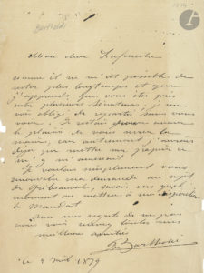 à une dame, regrettant de ne pouvoir se rendre à une invitation. – Lundi, à un ami : le docteur lui interdisant de sortir, il conseille à son ami de se faire représenter par un graveur. On joint 2 cartes de visite a.s. ; un feuillet du registre des obsèques de l’amiral Jaurès, avec de nombreuses signatures, dont Bartholdi et Ferdinand de Lesseps ; une photographie par Reutlinger (in-8) ; plus une l.a.s. de Louise Bartholdi.