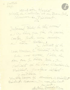 Antoine BOURDELLE (1861-1929). L.A.S., 6 juillet 1927, à Édouard Herriot, ministre de l’Instruction publique et des Beaux-arts ; 1 page in-4. « Infiniment touché de votre accueil à ce désir que j’ai de pouvoir...