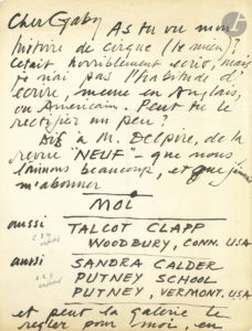 Alexander CALDER (1898-1976). L.A. (la fin manque), à « Cher Gaby » ; 1 page in-4. « As-tu vu mon histoire de cirque (le mien) ? C’était horriblement écrit, mais je n’ai pas l’habitude...