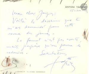 Antoni TÀPIES (1923-2012). L.A.S. avec dessins, Barcelone 15 mai 1970, à Jacques Tromeur ; 1 page oblong in-4 à son en-tête et adresse. Il lui envoie « le dessein que tu m’as demandé pour cette revue des jeunes. Le...