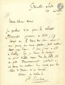 Hector BERLIOZ (1803-1869). L.A.S., Grenoble 20 août [1832], à son ami Humbert Ferrand, avocat à Belley (Ain) ; 1 page in-4, adresse. Il partira mercredi pour les Abbrets : « j’y serai à 8 heures du soir ; alors...