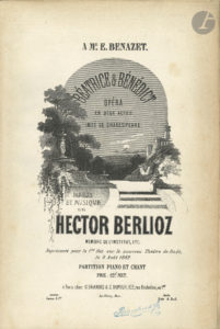 Hector BERLIOZ. Béatrice et Bénédict, opéra en deux actes imité de Shakespeare… (Paris, G. Brandus & S. Dufour, [1863]) ; grand in-8 (28 x 19 cm) de 2 ff.-200 pp., broché, sous chemise cartonnée de papier fort...