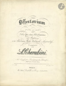 Luigi CHERUBINI (1760-1842). Offertorium, (O Deus ego amo te). Solo für eine Altstimme, mit Begleitung… (Wien, Anton Diabelli, [1827]) ; in-fol., 9 p., broché. Très rare édition, inconnue de Weinmann (Verlagsverzeichnis Anton...