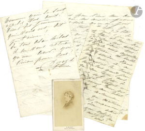 une longue liaison passionnée. De Londres, elle assure son amant infidèle de son amour : « Je n’ai d’autre souvenir que le tien ! d’autre joie à l’âme que celle qui peut me venir de toi ! Cette joie je l’éprouve à chaque lettre que je lis ! […] Tu me fais bien meilleure que je ne suis. […] Si j’étais ce que tu me fais, nous serions nous jamais quittés et d’autres femmes se seraient elles jamais appuyées sur ton cœur ! Hélas ! si j’étais un ange il y a longtemps que je t’aurais enlevé de la terre, où le diable a plus de pouvoir que moi ! […] Une pauvre femme t’a suivi plus d’une fois avec des yeux pleins de larmes et c’est alors qu’elle eut voulu des ailes pour t’entourer te protéger et te dérober ainsi aux séduisans démons qui m’ont volé tant de richesses ! Aime moi donc pour ce que je suis cher Arthur c’est-à-dire parce qu’entre toutes c’est moi qui t’ai le mieux aimé ! […] L’amitié de ta mère est un Baptême qui m’a purifiée je crois de bien des fautes et qui a marié nos deux âmes ! […] donne moi ton cœur, resté bon quand même ! Les battemens du mien y répondront toujours ! »… Etc. Nostalgique et triste, elle regrette la fin de cette aventure : « Hébien mon cher Arthur, le grand feu de paille est donc entièrement éteint. Lorsque j’ai quitté Londres je le trouvais déjà bien pâle. Mais ma visite chez vous n’en a pas même laissé une étincelle. […] J’ai eu tort. J’aurais du suivre ma 1re idée, repartir sans vous voir. […] C’était un rêve ! Je ne vous en veux pas mon pauvre enfant et je voudrais en effacer le souvenir dans ma mémoire comme j’efface chaque ligne de vos trop brulantes lettres. Car les rêves ! on les regrette souvent. Je ne voudrais conserver que votre affection qui m’a manquée pendant si longtemps. Je voudrais chaque fois que le hazard nous mettra face à face, n’avoir à nous deux qu’une seule main, comme une seule pensée ! […] Dans le ciel il n’existe qu’un amour ! Celui qui peut, qui doit toujours exister entre nous ! »… Etc. On joint 4 L.A.S. à Francis Plunkett, directeur du théâtre du Palais-Royal, lors de ses tournées à Clermont, à Lyon (en 1856), à Tours (1868) ; et 2 photographies (par J. Tourtin, formats cartes de visite) dédicacées au dos, 1873 et s.d.