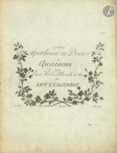 Carl Ditters von DITTERSDORF (1739-1799). Opera Apotheker et Doctor en Quatuors pour Deux Violons, Altoviola et Basse (chez Schott à Maience, [1791]) ; 4 parties in-fol., brochures avec couvertures de papier marbré d’origine avec...