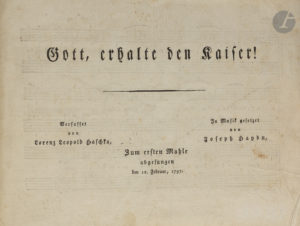Joseph HAYDN (1732-1809). Gott, erhalte den Kaiser ! Verfasset von Lorenz Leopold Haschka. In Musik gesetzet von Joseph Haydn. Zum ersten Mahle abgesungen den 12. Februar, 1797. Bifeuillet oblong in-4 (18,5 x 25 cm) monté sur onglet. Reliure...
