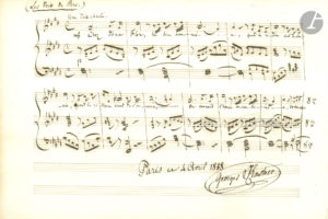 Georges KASTNER (1810-1867). Manuscrit musical autographe signé, Les Voix de Paris, Paris 14 avril 1858 ; 1 page oblong in-4 (petite fente). Page d’album pour chant et piano, sur les paroles : « Chez Dona Flor, la bien...