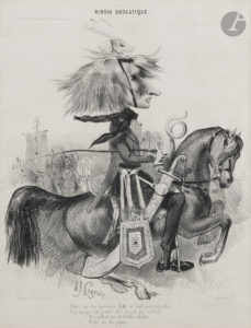 [Franz LISZT (1811-1886)]. Caricature-lithographie d’Alcide-Joseph LORENTZ (1813-1889), [1842] ; 31 x 24 cm (encadrée). Caricature publiée dans le journal Le Charivari, le 8 juillet 1842, dans la série Miroir drolatique. Liszt est...