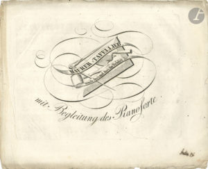 MUSIQUE MAÇONNIQUE. Musique gravée, Maurer-Tafellied. Durch drei mal drei ihr Brüder &c. mit Begleitung des Pianoforte, [s.l.n.d.] ; bifeuillet oblong in-fol. Rare édition privée de ce chant maçonnique, comportant le titre, et...