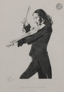 [Niccolo PAGANINI (1782-1840)]. Portrait gravé d’après Edwin LANDSEER (1802-1873), [vers 1836] ; 31 x 23 cm (encadré). Lithotinte publiée par Hullmandel, d’après le croquis original en possession du comte de Falmouth.