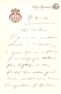 Camille SAINT-SAËNS (1835-1921). L.A.S., 17 avril 1882, [à Ambroise Thomas] ; 2 pages in-8 à la vignette d’Ars Gallica et à son adresse 14, Rue de Monsieur le Prince. Il espérait rencontrer le « cher Maître »...
