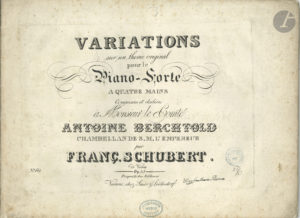 Franz SCHUBERT (1797-1828). Variations sur un theme original pour le Piano-Forte a quatre mains… Op. 35 [D 813] (Wien, Sauer & Leidesdorf, [1825]) ; in-4 oblong de 29 p., broché (qqs rousseurs). Première édition. Elle est...