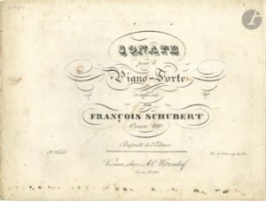 Franz SCHUBERT. Sonate pour le Piano-Forte composée par François Schubert., Oeuvre 120 [D 664] (Wien, A. O. Witzendorf, [1829]) ; oblong in-fol. de 18 p. (lég. rousseurs). Première édition. Musique gravée. Cotage A.O.W. 2656.