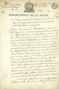 « l’ouverture du Théâtre Français de la République rue de la Loi » ; les administrateurs du Département l’informent que, pour maintenir la tranquillité aux environs du théâtre, ils vont faire expulser « toutes les filles publiques stationnées dans le pourtour de ce théâtre » ; ils voient avec plaisir « s’approcher l’époque où la scène française va reprendre son ancien lustre ». Le général Moulin se plaint des abus concernant les loges réservées aux officiers (22 nivôseVI). 2 ordres de paiement à en-tête du Théâtre de la rue Feydeau pour Marchand « artiste de la Comédie française » et Vigée « auteur de l’Entrevue », signés par les intéressés, ans IV et V. L.S. de l’architecte Antoine Vaudoyer à l’architecte Clément au sujet de travaux au théâtre de l’Odéon, 18 vendémiaire IX. L.S. du Préfet de Police Dubois, 23 thermidor X. « J’ai fait arrêter le jeune Roland, artiste du Théâtre des arts, et lui ai fait subir un interrogatoire. Il prétend qu’il avait assez mal à la gorge pour ne pouvoir chanter »... 3 imprimés, loi et 2 décrets de la Convention, relatifs aux spectacles, 1791-1793.