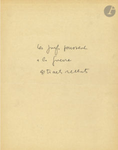 quelques petites coupures... intéressantes peut être »... Une note autographe indique : « Les Juifs poussent à la guerre extraits récents ». Une autre note donne la liste de deux articles relevés dans le numéro du 26 février 1939 de L’Action Française : « Ce numéro de l’AF du 26 Fev me semble intéressant parce qu’il reproduit à peu près exactement notre cas, dans un même numéro. – en première page, 5e colonne accusations bellicistes (Des nouvelles...) [« Des Nouvelles de MM. de Rothschild » par Charles Maurras] – en seconde page, 2e colonne (La conquête Juive) [donnant la liste des Juifs élus à la Chambre syndicale de la Meunerie de Paris] ».