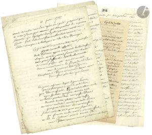 et in-8, 2 adresses. Belle correspondance érudite : dissertations autour de livres (une lettre en partie écrite en grec), l’expédition d’ouvrages, etc. Une lettre de juillet 1789 est relative à l’envoi de livres, en particulier les Œuvres de La Fontaine reliées en maroquin et « les lettres de Mirabeau à ses commetteurs ». Certaines lettres témoignent des événements révolutionnaires : « Je ne crois pas que Barthélemy fut un conspirateur ; mais il étoit un homme faible qui a voulu choyer la chèvre et le chou qui, prôné par l’aristocratie avant et après son élévation, n’a pas voulu manquer aux gens comme il faut, dont il avoit toujours fréquenté la compagnie et qui enfin s’est laissé circonvenir par ce rusé Carnot, républicain à la manière de Mde O… ayant du caractère, de l’effronterie, embrassant à la tribune après le 9-thermidor la cause de ses collègues Barrère, Collot-d’Herbois, etc. »…