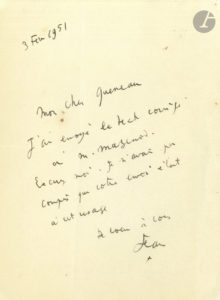 Jean COCTEAU. L.A.S., 3 février 1951, à Raymond Queneau ; 1 page in-8. « Mon cher Queneau. J’ai envoyé le texte corrigé à M. Mazenod. Excusez-moi. Je n’avais pas compris que votre envoi était à cet...
