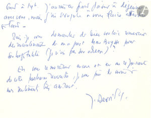 Jacques DERRIDA (1930-2004). L.A.S., 24 février 1970, à Marcel Spada (1923-2014), directeur de l’École des Hautes Études de Gand ; 2 pages oblong in-12 sur carte à en-tête de l’École Normale Supérieure,...