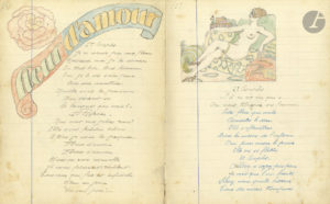 érotiques (Seul avec ma cousine, Prise d’un pucelage, Les Dactylographes…), et illustrés de dessins rehaussés aux crayons de couleur (scènes galantes, femmes nues, etc.). On note également quelques chansons patriotiques sur l’Alsace-Lorraine. Certains portent le nom de l’auteur-possesseur : Nicolas Gauthier (23e régiment d’infanterie à Autun), Roman Meunier (Pontlevoy), caporal Pierre (classe 1900), Émile Landry (chasseur alpin, classe 1907), Jean Mariette (classe 1896), H. Cantournet (garçon limonadier, au 23e Colonial à Saintes, Rochefort et Paris), Jean Mathieu (du 23e à Salin, classe 1909), Pierre Bignolais (guetteur poste vigie à Lorient), Adrien Preschez (du 148e à Sedan)… Ex libris A J.