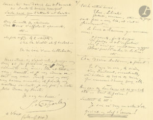 d’automne… « je veux vous dire ce que j’admire par-dessus tout : L’âme d’automne. Moi qui depuis longtemps suis saisi par ce rêve d’écrire – en méchante prose – les rois casqués, les paysages de marjolaine, les troubadours, et le combat de la lance, je demeure muet d’admiration devant vos rêves à vous. Vous avez les yeux lointains, vous avez vu le joli, l’enivrant, je n’avais conçu que le rude »... Etc. Et il cite de nombreux vers (et des strophes) qu’il a particulièrement aimés… « Vous êtes un grand poëte, et je le dirai un jour. Il n’y a qu’une façon de causer aux artistes, c’est de leur désigner ce qu’on a le plus aimé d’eux, sans réflexion, sans critiques, car il faut laisser marcher ceux qui ont de la force, et ne leur indiquer aucune route. Eh bien, le premier poëme est remarquable d’allure, de beauté raide et grave : L’enchanteresse de Thulé a ravi mon âme en son île »… Etc. Il ajoute : « Jamais je n’ai écrit une lettre aussi longue ! » On joint 2 autres lettres adressées à Stuart Merrill par Nathalie Berry Boynton (Paris 26 avril 1915) et sa cousine Virginia Watson (New York 26 janvier 1914). Plus 2 lettres adressées à Claire Merrill par les poètes André Fontainas (23 décembre 1915) et Georges Marlow (condoléances).