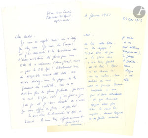 [André FRAIGNEAU (1905-1991)]. 33 L.A.S. à lui adressées, 1957-1990. Belles correspondances amicales, littéraires et intimes. Michel BULTEAU. 6 L.A.S., écrites de Labessette, Pontacq et Cintra (Portugal), 1986-1990. Il parle de ses...