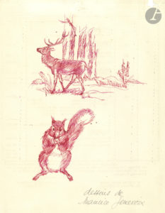 Maurice GENEVOIX (1890-1980). 2 DESSINS originaux ; 1 page in-4, au dos d’un rapport financier dactylographié du Ministère des Affaires culturelles. Genevoix a dessiné, au stylo bille rouge, un cerf de profil devant une...