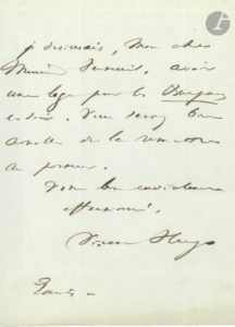 Victor HUGO. L.A.S., [mars ? 1843], à Alexis Verteuil (secrétaire général de la Comédie-Française) ; 1 page in-8. Il demande « une loge pour les Burgraves ce soir » et prie de la remettre au porteur. [Le drame...