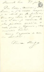 Victor HUGO. L.A.S., Hauteville house 22 juillet ; demi-page in-8. « Je ne cherche que la justice ; vous avez raison de le penser et de le dire. Je saisirai la plus prochaine occasion de rendre justice à Copernic, sans amoindrir...