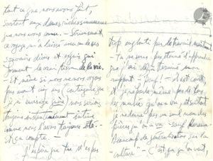 Québec, Égypte, Amsterdam, Grèce, Allemagne et Florence… –1952 « Te voilà dans les fleurs, à l’ombre des jeunes filles. Ici il pleut toujours. Mais Paris se prépare pour être à son plus beau moment lors de notre départ »… – « Déjà Québec est loinissime. Me voici établi définitivement à Englewood. Et toi dans les “coulisses” complices de la Queen Mary. J’espère que ce monde immondissime que j’ai cru apercevoir ne t’a pas écrasé. Tous à Dachau ! Et comment étaient tes compagnons de cabine. J’espère qu’ils te méritaient ! […] Demain matin je vais commencer à écrire mon “rapport” – Pouf ! – Mais je regrette que rien, mais si je voulais, ne pourrait communiquer l’enchantement, la folie et le plaisir vraiment profond que toute cette aventure m’a donné. J’espère seulement que tu as pris autant de plaisir à être avec moi que moi avec toi – et que tu sens, comme moi, que même que si ce sentiment n’avait pas été né avant, maintenant nous sommes liés par ça dans l’affection pour toujours »… – « Je pense si souvent à nos aventures ensemble. C’était, c’est fantastique, aussi bien dans le souvenir que dans l’anticipation et la réalité. Tant de choses ! Mon Dieu ! […]. Je travaille à refaire mon roman, et j’ai grand espoir à ce qu’il soit édité. Je sors peu, mais je crois que j’irai vivre à New York vers la fin de l’automne ; je ne peux pas rester sous le toit familial quand même infiniment. Est-ce que tu as vu Jean [Cocteau] ? On s’écrit souvent et il veut que je traduise le Journal d’un Inconnu en anglais, ce que je ferai si je peux. […] Je songe très très souvent à nos soirées exquises partant de la Rhumerie – comment je voudrais être là ce soir ! »… – « Je travaille comme mon propre bourreau à refaire ce maudit roman, mais ça avance et je crois que je puisse espérer le mieux : que ça soit édité enfin […]. Jean m’écrit que Bâââââchus a été un triomphe à Düsseldorf (38 rappels). Les chéris ne nous trahiront jamais ! Il rentre à Milly vers le cinq novembre, dit-il […] Embrasse-le pour moi quand tu le vois. Ned [Rorem] est à New York […]. Je dois le voir cette semaine. On parlera longuement de toi, et ça sera délicieux de reprendre ainsi contact avec tout ce que j’aime de Paris. New York n’est pas bien drôle. J’ai été au théâtre et au ballet plusieurs fois. J’ai vu le nouveau film de Chaplin Limelight, qui est sentimental et tout ce qu’on veut mais merveilleux quand même comme seul lui au monde peut l’être. Barrault vient ce mois-ci et j’irai le voir jouer Scapin et Le Procès »… – 1953. « Je travaille, venant de terminer un tout petit roman de 27,500 mots environ. Oui, je compte traduire Journal d’un Inconnu et aussi La Difficulté d’être, si je peux arranger une édition des deux dans un même volume, ce qui ferait un beau livre […]. Je pense que j’irai voir d’Anus et Marschall bientôt. Je veux qu’ils donnent un peu d’argent – que dis-je ? – beaucoup d’argent à mon musée Cézanne à Aix – le projet avance bien. J’ai déjà ramassé un million, mais il me faut encore quatre »… – 1954. « J’ai été très heureux de recevoir ta gentille lettre. Tu sais si bien établir par des mots ce contact intime qui m’était si délicieux pendant nos semaines ensemble. Être un écrivain, au fond, c’est ça, je pense. Tu ne peux pas t’imaginer comme je songe souvent à tout ce que nous avons fait, surtout aux dames richissimmmmmmes [dessin] que nous avons connu. Sérieusement ce voyage m’a laissé avec un de ces souvenirs divers et exquis qui forment le vrai tissu de la vie. Et même si nous ne nous voyons pas avant cinq ans (contingence que je n’envisage guère), nous serions toujours instantanément intimes comme nous l’avons toujours été. Et ça compte »… Etc.