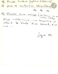 surréalistes : « 1/ Le hochet matraque 2/ Le hochet (os de) fémur 3/ L’ours-péteur 4/ La poupée vampire : ses canines poussent 5/ La fleur qui pue […] 10 / Fouets pour poupée […] 13/ Jeux de construction déséquilibré 14/ Poupées sans visage (en tissu ou en carton pâte) d’âge indéterminé, sur lesquelles on collerait la photo d’un parent, d’un ami »… On joint 2 L.A.S. de Jacques Dupin à Tromeur, 1975.