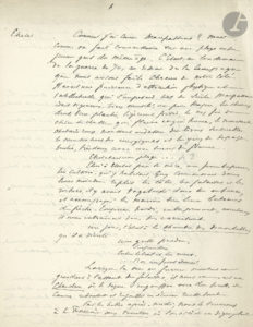 témoignages sur Maupassant, rédigés par son ami intime Léon Fontaine, dit « Petit Bleu » ; ce précieux témoignage sur leur jeunesse, sur la vie de « Joseph Prunier » (surnom de Maupassant), puis sur son déclin et sa fin tragique, probablement rédigés en vue d’une causerie avec Pierre Borel, a dû servir à la rédaction du livre Le Destin tragique de Guy de Maupassant, publié sous les noms de Pierre Borel et « Petit Bleu » (Les Éditions de France, 1927). Le premier manuscrit, qui porte le titre (paginé 1-4), est le début d’un texte de 39 pages [les pages 5 à 39 ont figuré dans notre vente du 14 avril 2015 (n° 135)]. Petit Bleu accepte de raconter à Pierre Borel ses souvenirs de Maupassant, et commence par évoquer Étretat. Le second manuscrit, sans titre, compte 22 pages ; des rubriques sont portées en marge ; certains passages comportent un début de phrase puis le renvoi à des pages du manuscrit précédent. – Étretat : « Comment j’ai connu Maupassant ? Mais comme on fait connaissance sur une plage entre jeunes gens du même âge »… – Paris : « A Paris, Maupassant a commencé par occuper une modeste chambre au rez de chausse d’une maison 2 rue Moncey »… – Argenteuil : « Dès les premiers jours du printemps le sang de Guy bouillonnait dans ses veines »… – Bezons : « Puis ils abandonnèrent Argenteuil, descendirent la Seine, […] ils s’installèrent chez Fournaise »… – Sartrouville : « Lorsque le succès foudroyant de Boule de suif eut donné une notoriété subite à Maupassant »… – Les amis de Maupassant (Flaubert et Zola). – Les débuts : « Le véritable début littéraire de Maupassant fut un conte signé Joseph Prunier »… – Le destin tragique. – Maupassant et les femmes. – Le macabre chez Maupassant…