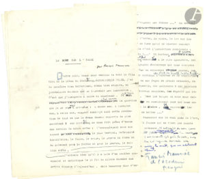 François MAURIAC. Tapuscrit avec additions et corrections autographes, La Mort par l’image, [1951] ; 4 pages in-4. Compte rendu de Mademoiselle Julie, adaptation cinématographique de la pièce d’August Strindberg par Alf...