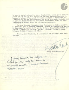 « pour la publication d’une partie de mon théâtre », dans laquelle il aimerait voir figurer entre autres Fils de Personne et Demain il fera jour. « Cette formule de cinq pièces » a déjà été adoptée en Espagne, à New York, à Londres et en Allemagne : « Ainsi il y aurait dans les grandes nations d’Europe une formule unique ». Pour la traduction, il demande de faire un test en confiant le 3e acte du Maître de Santiago à plusieurs traducteurs, et il choisira ensuite lui-même, après consultation de personnes qualifiées, le traducteur de la totalité du volume, et si ce dernier « faisait un travail hautement satisfaisant, je serais prêt à envisager de lui donner l’exclusivité des droits de traduction des pièces, y compris les droits pour la représentation ». Il ajoute, de sa main : « Je désire surtout que mes traducteurs ne prennent pas de libertés avec mon texte, ne traduisent pas une expression un peu rare, étrange, par une expression banale, sous prétexte que le public serait choqué de cette traduction […]. Bref je désire que mes traducteurs non seulement connaissent bien les deux langues, mais soient aussi de véritables écrivains »… Il ajoute que le Théâtre Hébertot va jouer Le Maître de Santiago en français à Rome, et dans la plupart des grandes villes d’ltalie… On joint une L.A.S. au même, 13.I.1951 (1 p. in-8, remerciant pour un article et évoquant Malatesta.