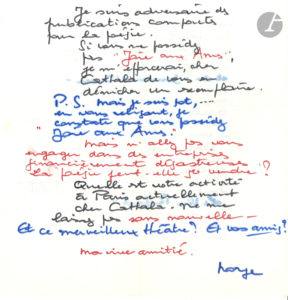 Georges Mogin dit NORGE (1898-1991). 3 L.A.S. et un poème a.s., Saint-Paul de Vence 1971-1973, à Jean-Paul Cathala ; env. 6 pages in-4 et une carte oblong in-12, 3 enveloppes dont une décorée, la plupart aux feutres bleu et rouge....