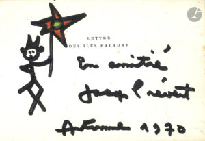 Jacques PRÉVERT (1900-1977). Lettre des Îles Baladar, avec dédicace a.s. et dessin, 1970 ; oblong in-8, broché. Édition originale (Le Point du jour, nrf, Gallimard, 1967) avec 2 étiquettes autographes collées sur la...