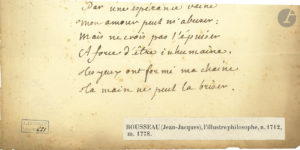Jean-Jacques ROUSSEAU (1712-1778). Poème autographe ; 1 page oblong in-8 oblong, étiquette d’identification collée en marge inférieure, cachet de la collection Juncker. Six vers inédits sur l’amour : « Par...