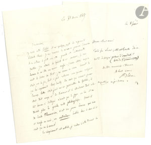 professeur à la Faculté des Sciences de Poitiers, avait publié Galilée, sa mission scientifique, sa vie et son procès (Potiers, 1865). Il a reçu son Galilée, « et vos quelques mots de réponse à Philarète Chasles. Je vous remercie de m’avoir procuré l’occasion de m’instruire à fond sur cette grande et intéressante question. J’ai admiré la légèreté de ces messieurs ; je suis heureux de m’être au moins méfié. J’avais étudié ce qu’a écrit là-dessus M. Biot ; j’ai connu ce vieux savant. Il était, vers la fin, tout à fait retourné aux opinions religieuses qui lui imposaient leurs limites. Son cœur qui n’avait jamais battu était froid sur ces persécutions de Galilée ; il était tout occupé à les diminuer et à édulcorer tout cela. Cet homme si distingué n’avait pas le foyer en lui et ne tenait plus à la grande route philosophique. Quant à M. Camille Flammarion, c’est un jeune homme qui vise et sacrifie au succès, un entraîneur habile dans le sens où il croit que va le courant »… On joint 4 L.A.S. et 1 L.S. à son ami le bibliothécaire Antoine Rochebillière ; et 2 autres L.A.S. à E. de Monglave et J. Saint-Amour.
