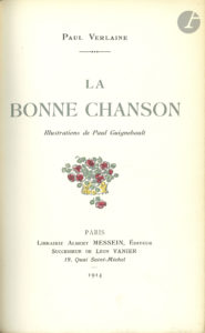 Paul VERLAINE. La Bonne Chanson. Illustrations de Paul Guignebault (Paris, Albert Messein, 1914) ; in-8, reliure veau citron, couv. conservée (rel. lég. usagée). Tirage à 550 exemplaires, dont 500 sur papier vélin à la forme...