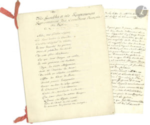 en vers, d’une élégante écriture, pour demander le rétablissement des ballets de la Comédie Française qui était jalouse du succès de l’Académie de Musique, citant « Aroüet, pauvre énergumène », parti « courir au loin le loup-garou »… On joint la copie d’époque d’une lettre de Voltaire à Le Cat du 26 mars 1765 ; plus 7 L.A.S. par F. Coppée (2), F. de Croisset (2), Lacordaire (2, plus une carte), V. Margueritte.