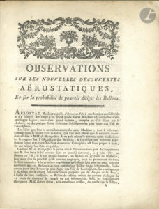 AÉROSTATION. Imprimé, [Mathurin BRISSON], Observations sur les nouvelles découvertes aërostatiques, et sur la possibilité de pouvoir diriger les Ballons…, [1784] ; in-4 de 34 p., cartonnage moderne. Ces Observations...