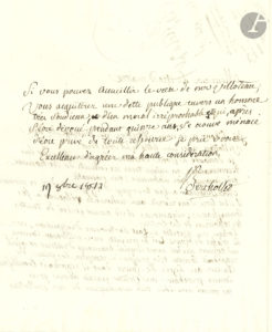 estimable » ; il a fait le voyage d’Égypte, et s’est livré dès lors à la recherche, mais se trouve privé de toute ressource… Berthollet prie d’accorder à Villoteau la place de « de censeur au lycée de Tours », pour lequel il conviendrait parfaitement : « vous acquitterez une dette publique envers un homme […] d’un moral irréprochable et qui, après s’être dévoué pendant quinze ans, se trouve menacé d’être privé de toute ressource »…